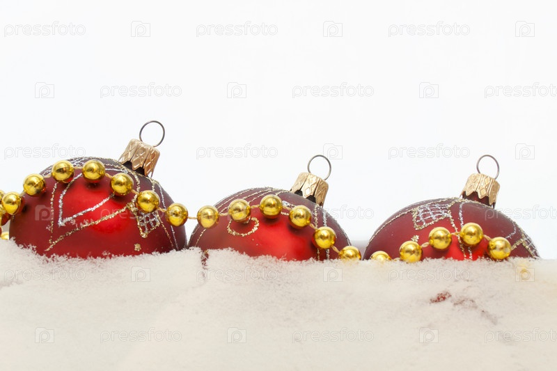 Красные елочные шары лежат в снегу на белом фоне