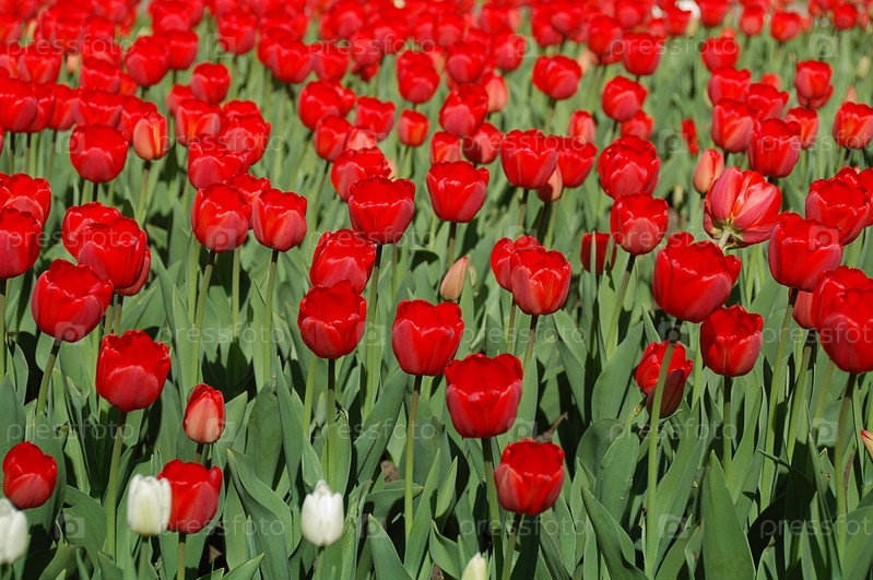 Красные и белые тюльпаны на клумбе