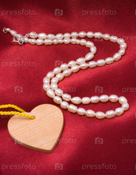 Белые жемчужины и деревянное сердце на красном атласном занавесе