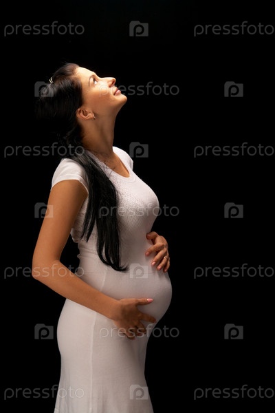 Беременная женщина в белом платье на черном фоне