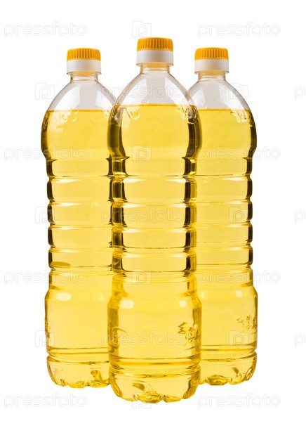 Три бутылки растительного масла на белом фоне