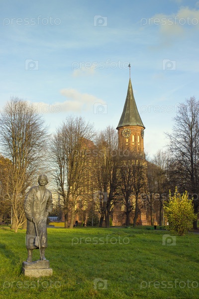Памятник А.М. Горькому в Калининграде на острове Канта на фоне кафедрального собора