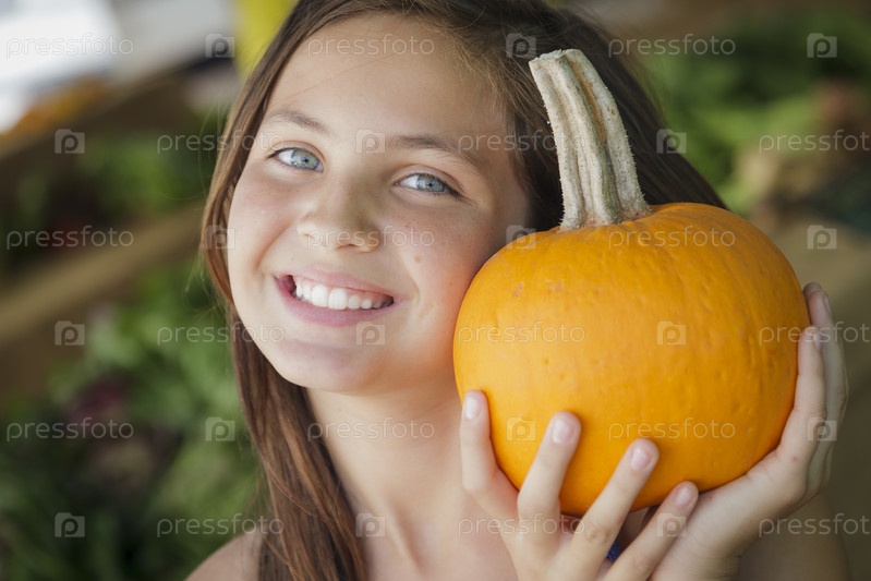 Хорошенькая девочка с тыквами на рынке