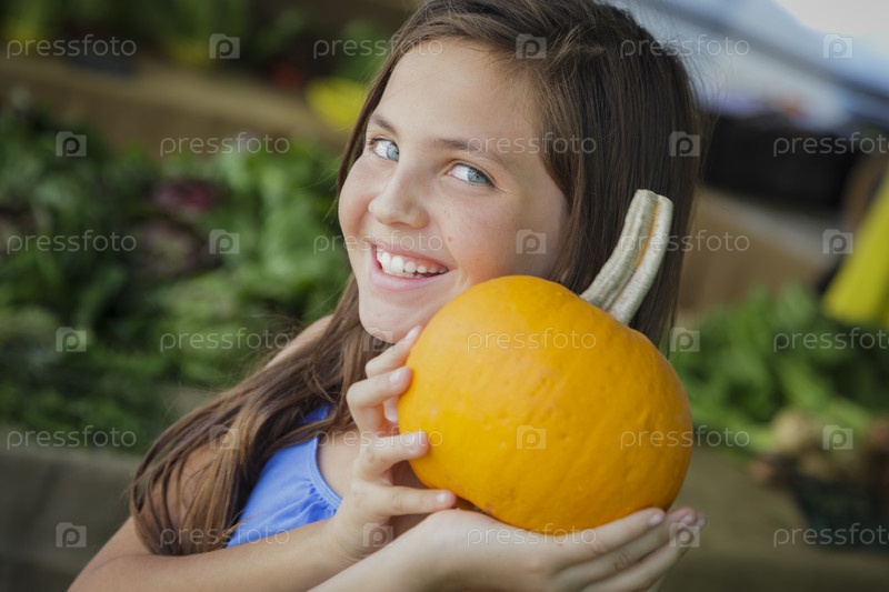 Хорошенькая девочка с тыквами на рынке