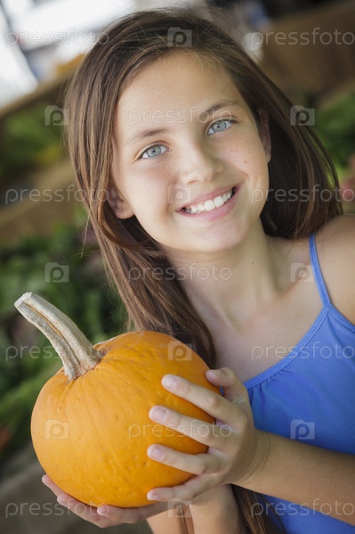 Хорошенькая девочка с тыквами на рынке