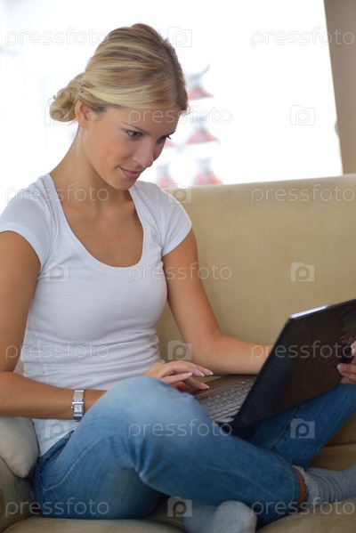 Женщина, работающая на ноутбуке дома