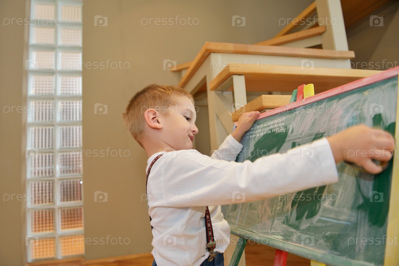 Мальчик со школьной доской дома