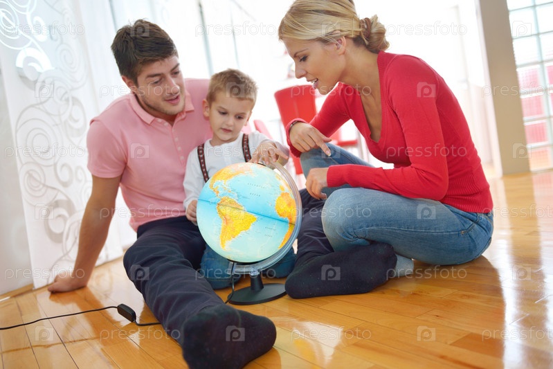 Семья играет с глобусом