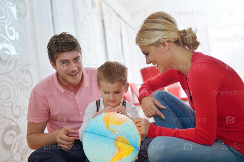 Семья играет с глобусом