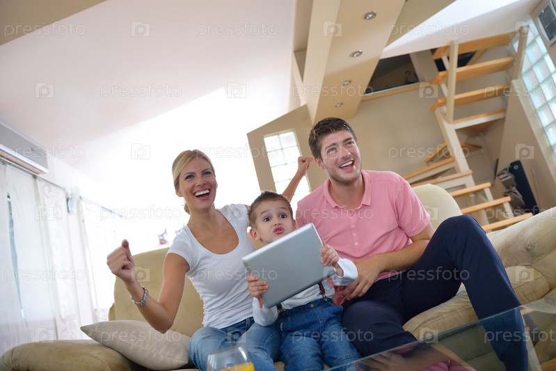 Семья использует планшетный компьютер