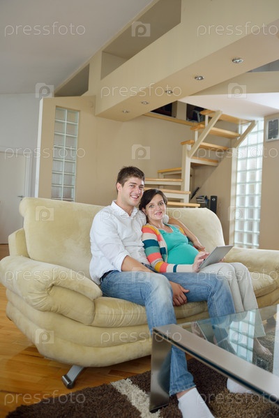 Пары, ожидающая ребенка, с планшетным компьютером