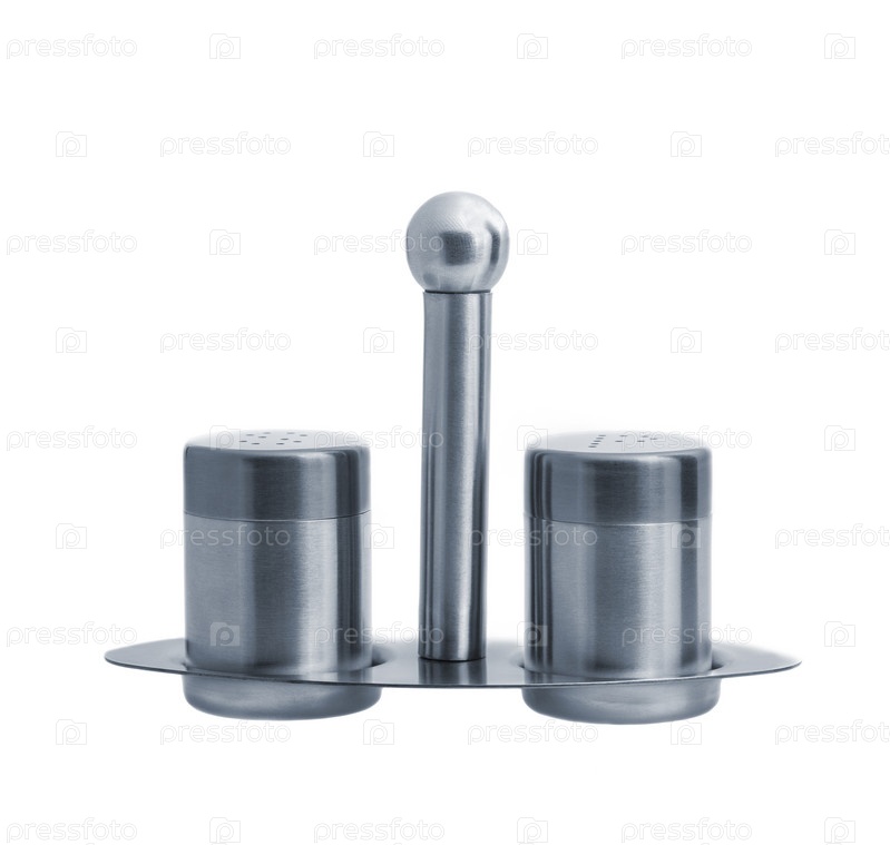 Металлическая солонка и перечницаы, изолированные на белом фоне