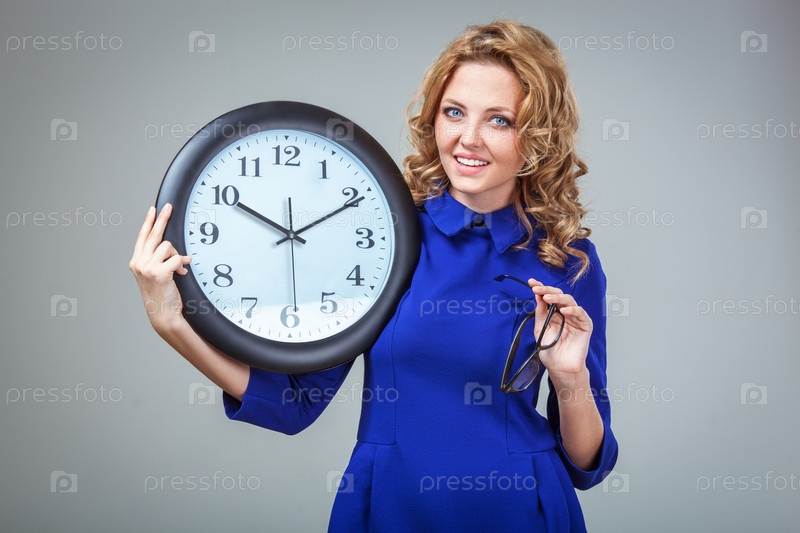 Женщина держит большие часы