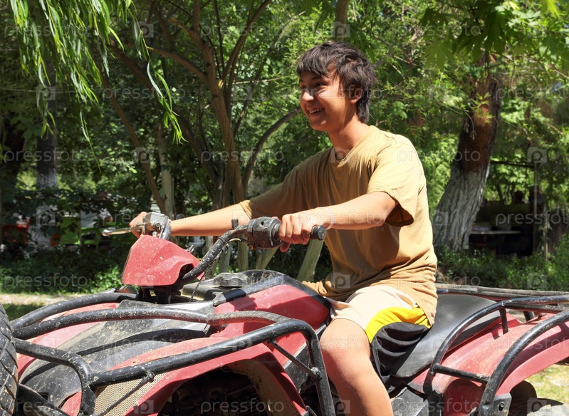 Счастливый азиатский мальчик на квадроцикле