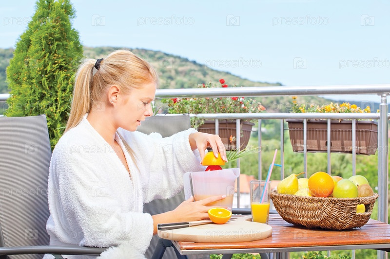 Женщина делает сок утром на террасе