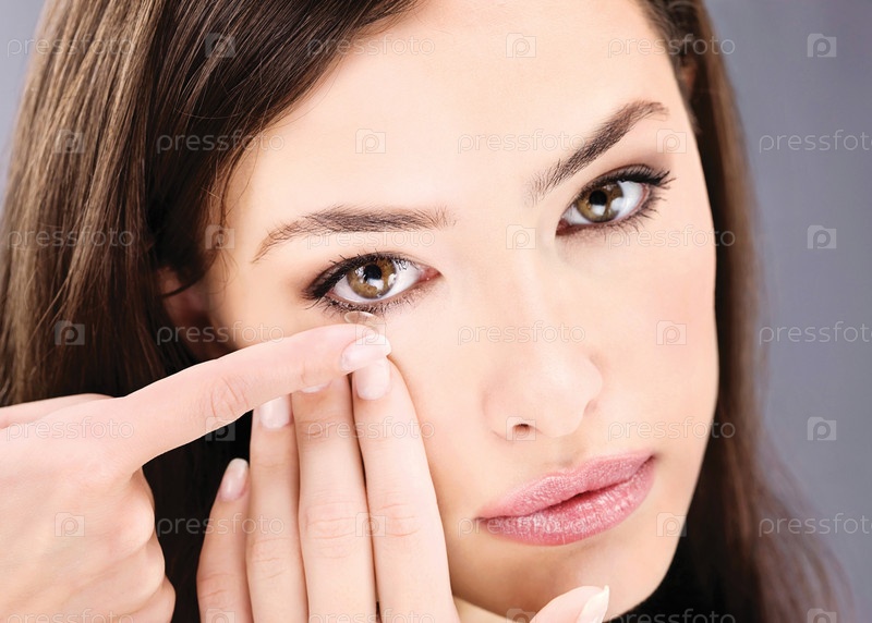 Женщина одевает контактные линзы