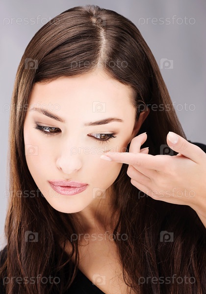 Женщина одевает контактные линзы