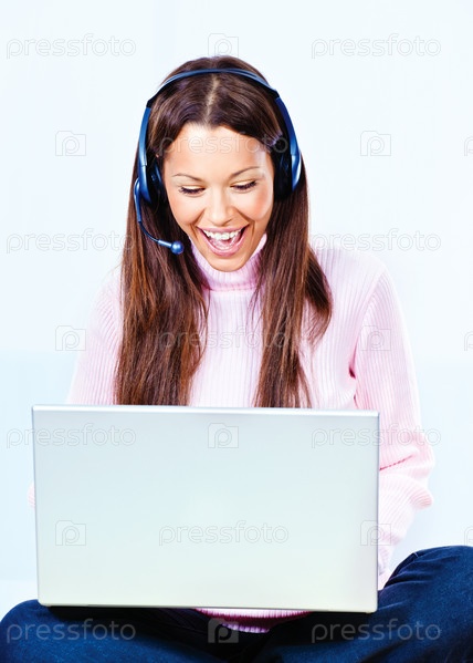 Брюнетка с наушниками и ноутбуком общается через Интернет