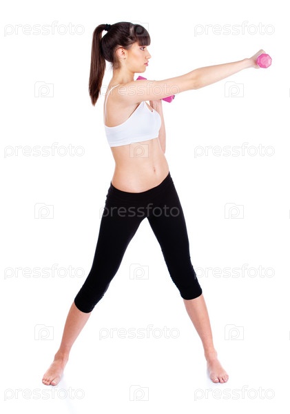 Брюнетка делает упражнения, изолированная на белом фоне