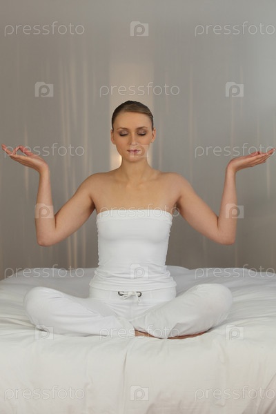 Женщина медитирует в спальне