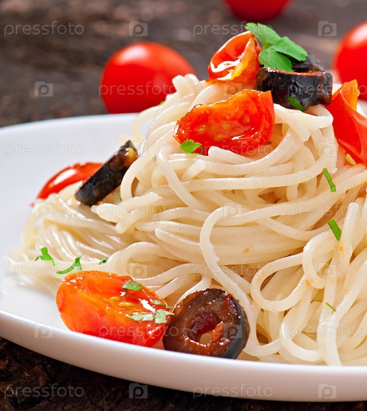 Спагетти с помидорами и оливками