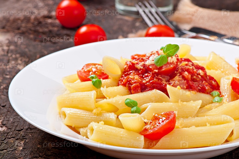 Макароны пенне с соусом болоньезе, сыром пармезан и базиликом