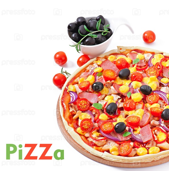 Пицца с овощами, курицей, ветчиной и оливками, изолированная на белом
