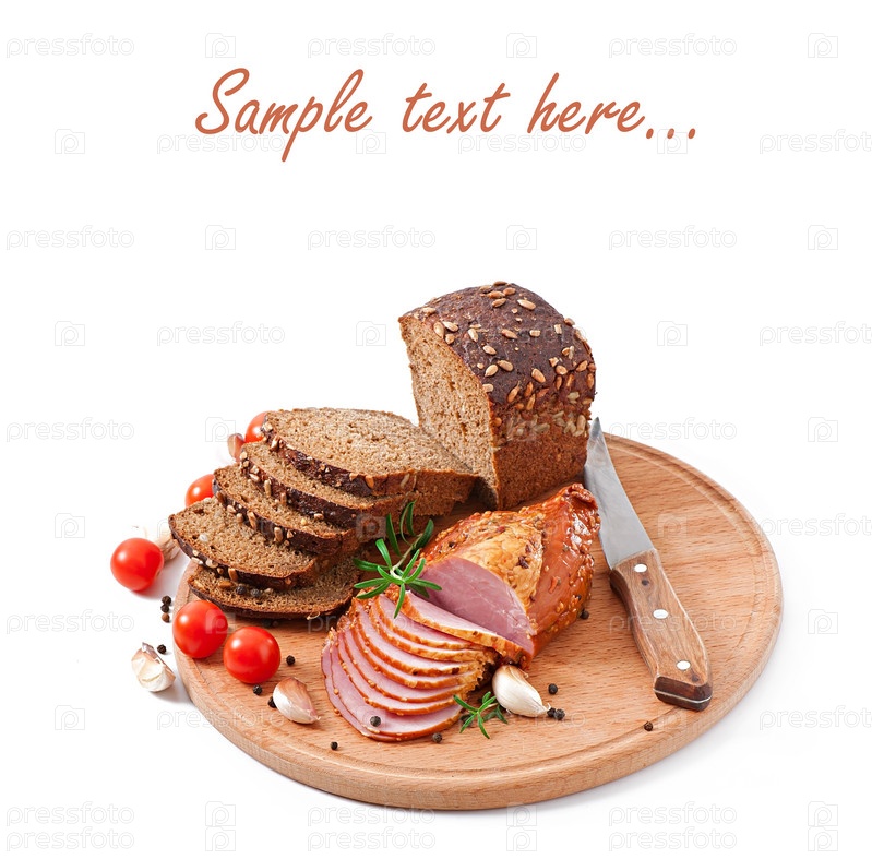 Ветчина, хлеб и специи на деревянной доске