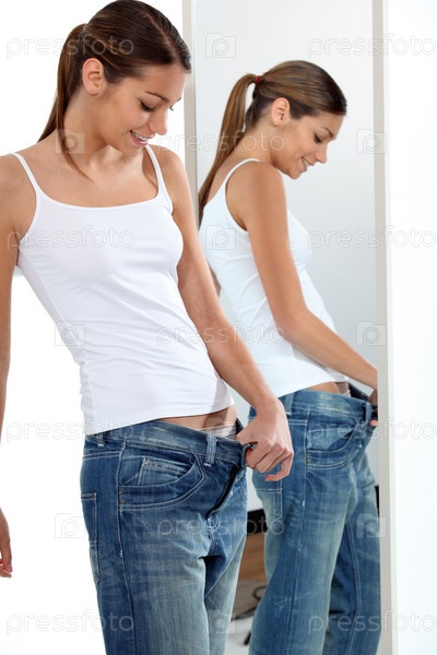 Худая молодая женщина оттягивает пояс брюк