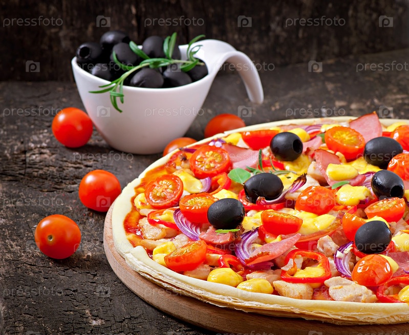 Пицца с овощами, курицей, ветчиной и оливками