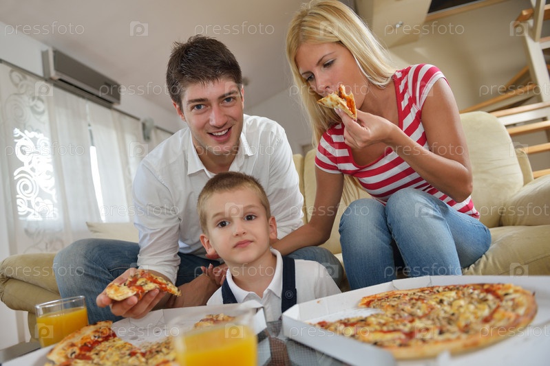 Семья ест пиццу