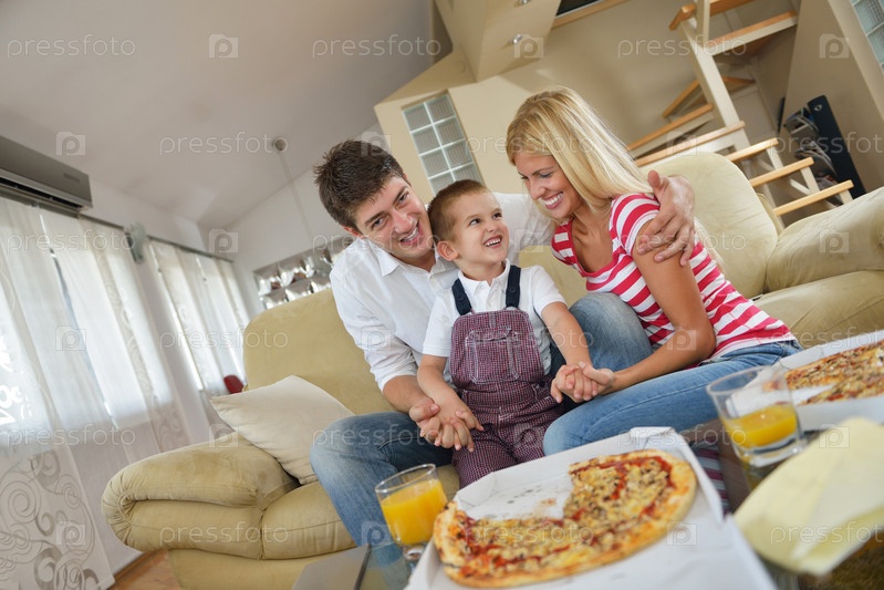 Семья ест пиццу