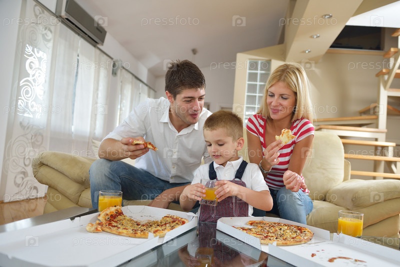 Семья ест пиццу