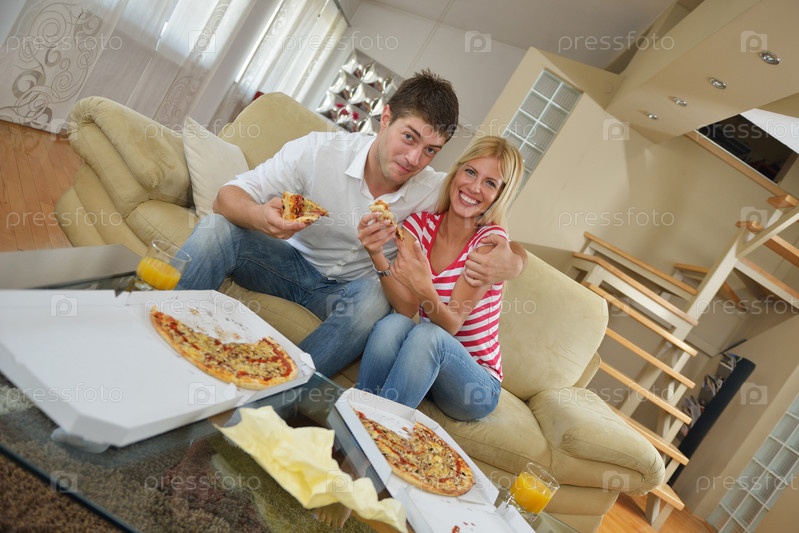 Пара ест пиццу дома