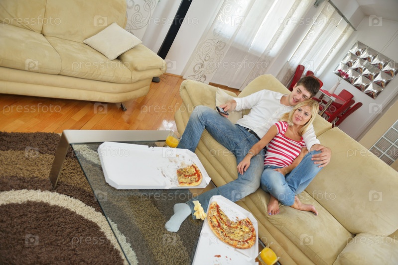Пара ест пиццу дома