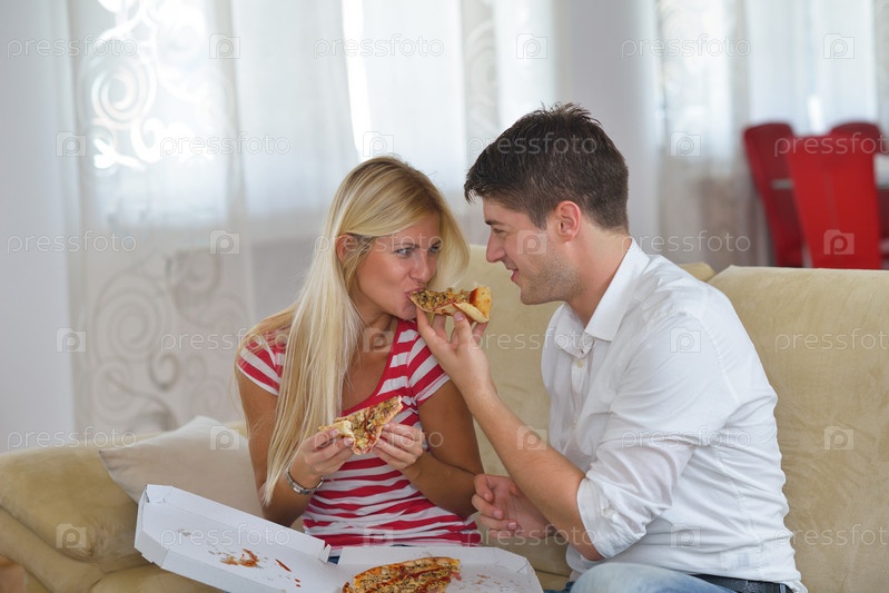 Пара ест пиццу дома