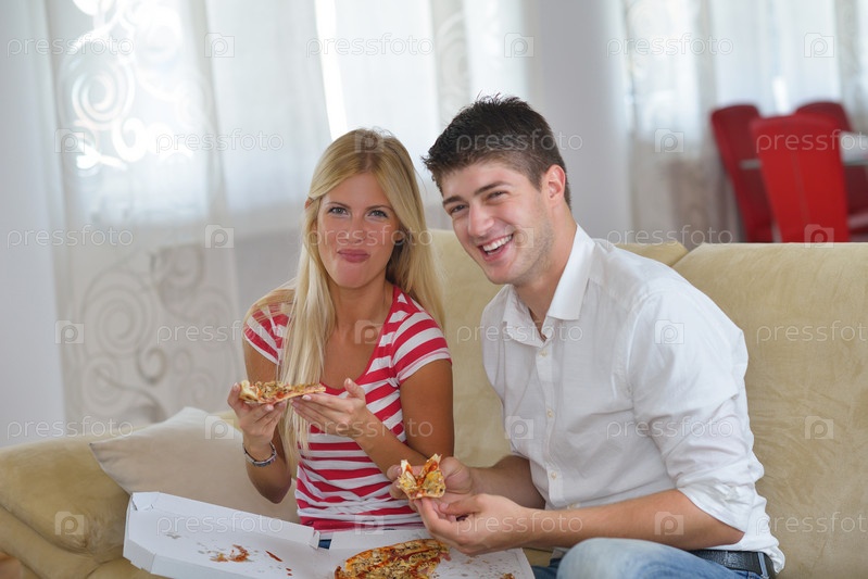 Пара ест пиццу дома