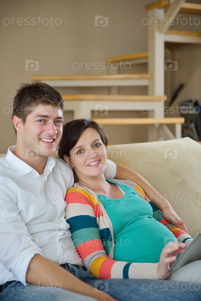 Беременная женщина с мужем на диване