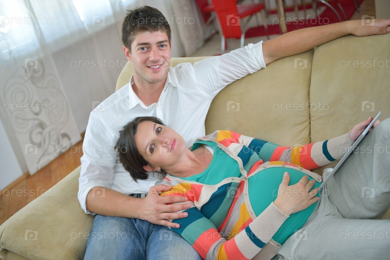 Беременная женщина с мужем на диване