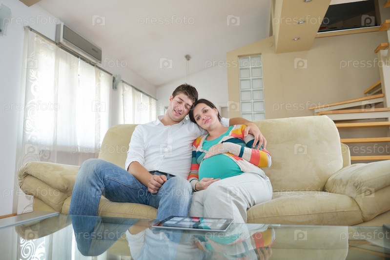 Беременная женщина с мужем на диване
