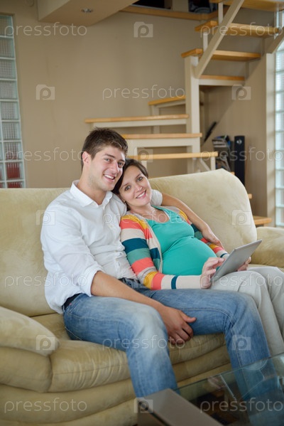 Беременная женщина с мужем на диване