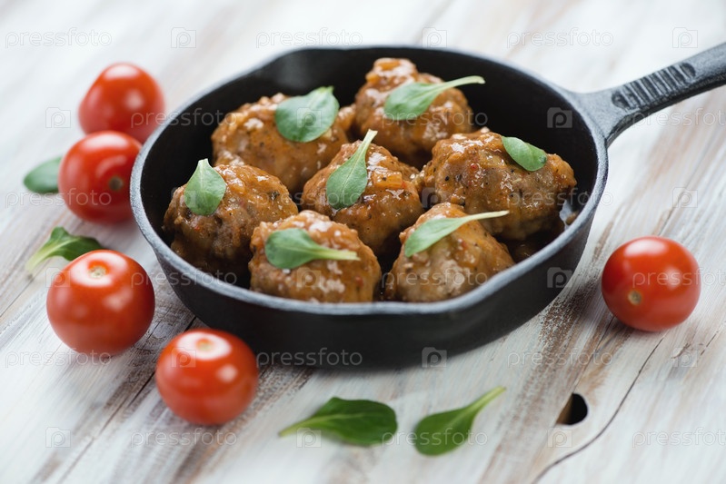 Сковорода с тефтельками на деревянном фоне