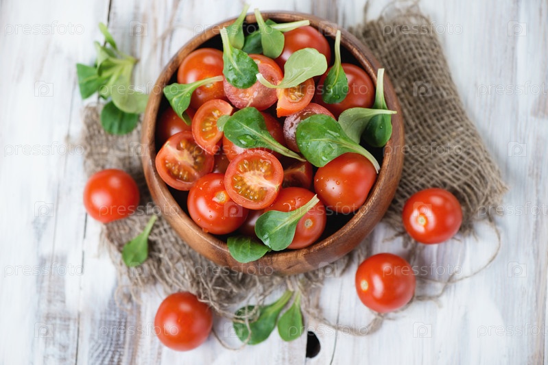 Свежие помидоры и салат корн на деревянном фоне