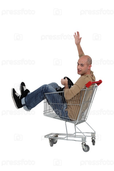 Мужчина с рулем сидит в тележке