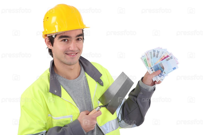 Рабочий держит шпатель и деньги