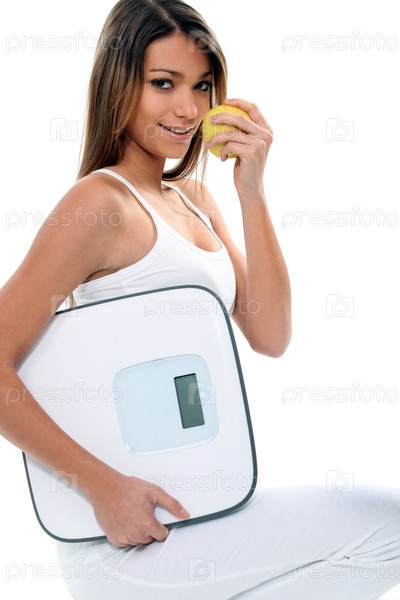 Стройная девушка с яблоком и весами