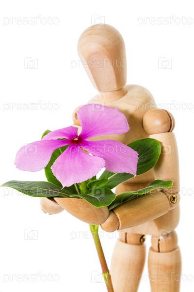 Деревянный манекен держит свежий розовый цветок барвинок, изолированный на белом фоне