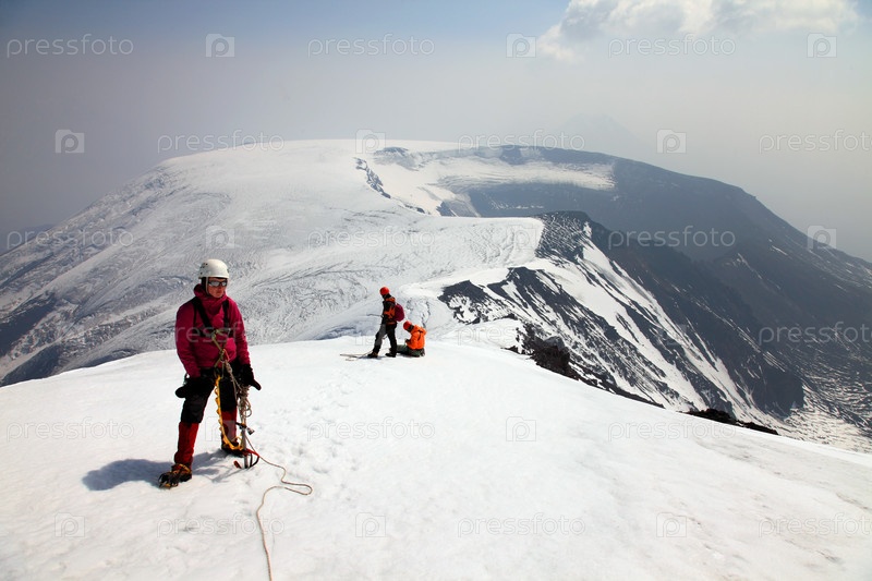 Альпинисты на вершины вулкана Острый Толбачик Толбачик (Плоский Толбачи на заднем плане). Камчатка. Россия