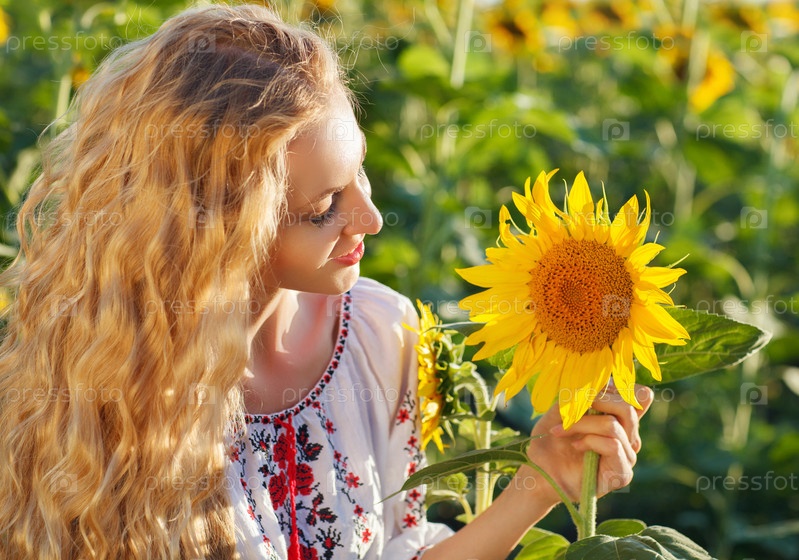 Счастливая молодая женщина с длинными волосами в поле подсолнечников