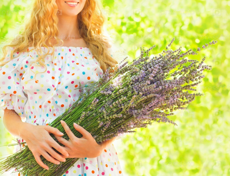 Женщина с длинными светлыми волосами с букетом лаванды